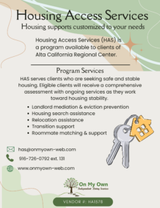 Housing Access Services serves clients of any age who need safe and stable housing. The services are provided on a 1:1 ratio. Clients must have been diagnosed with an intellectual or developmental disability, and be approved for services through Alta California Regional Center (ACRC). Includes two components: